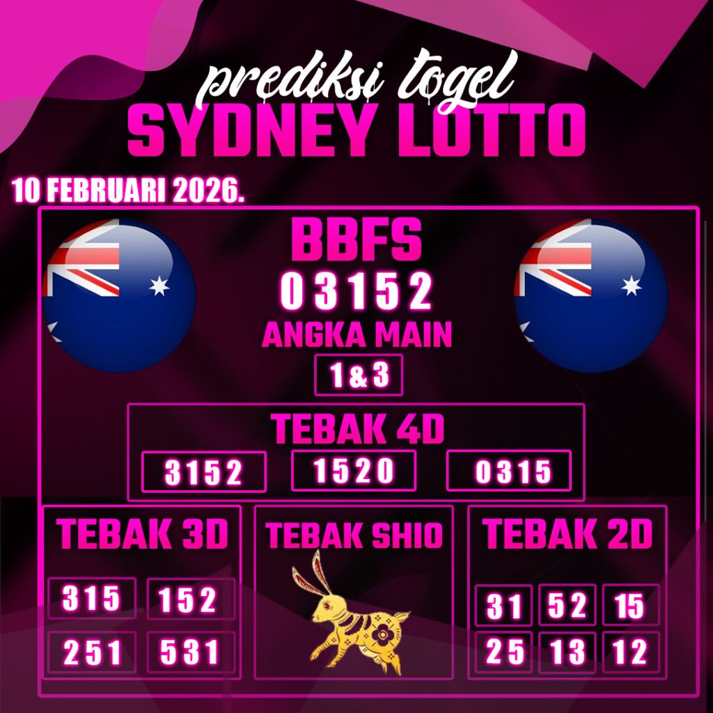 Togel SYDNEY adalah pasaran terlaris yang hampir tidak pernah tergantikan. Setiap harinya ribuan pengguna memburu dan mencari prediksi jitu seputaran togel Sydney hari ini. Nah, dibawah ini adalah prediksi togel Sydney Lotto 10 FEBRUARI 2026 terbaik.